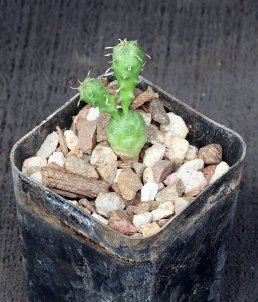 As the epithet indicates, this species is very similar to Euphorbia globosa. These plants have nearly spherical to elongated yellow-green bodies that produce numerous tubercled branches that, in turn, produce non-persistent peduncles supporting cyathia. With time, the bodies clump, forming a globose mass. These plants are seedlings in 2-inch pots.
