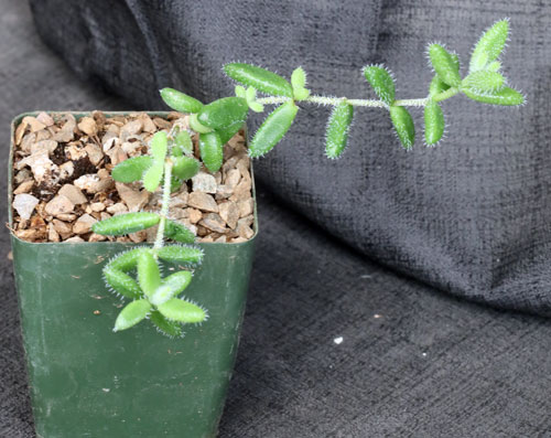 This species is from the Eastern Cape Province of South Africa. The leaves are covered with rather stiff hairs, which explains the epithet. The flowers are relatively small and a dirty yellow color. These plants are rooted cuttings in 4-inch pots.