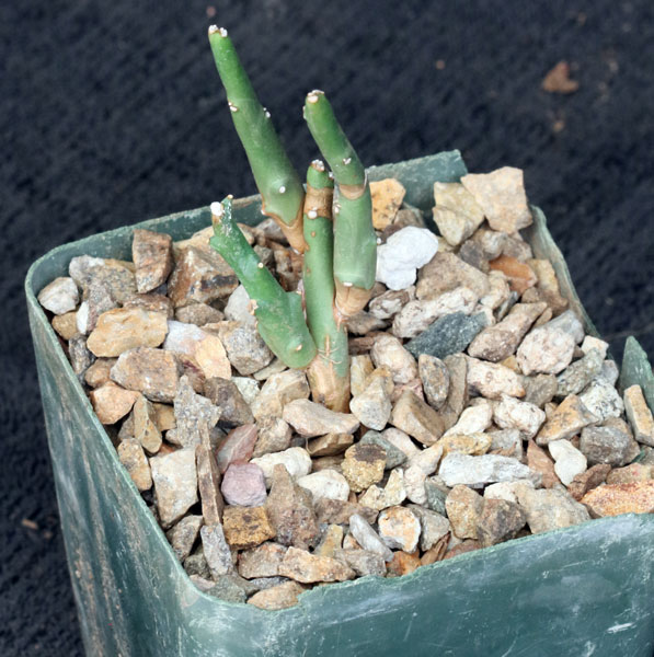 This subspecies is from central Namibia (WY 1202), where it grows in very arid areas. This little shrub features woody stems with erratic tubercles and pointed (but relatively soft) tips. The leaves are small, lanceolate, and deciduous. This subspecies differs from the typical species in the cyathia, which are small and light yellow. These plants are seedlings in 4-inch pots.