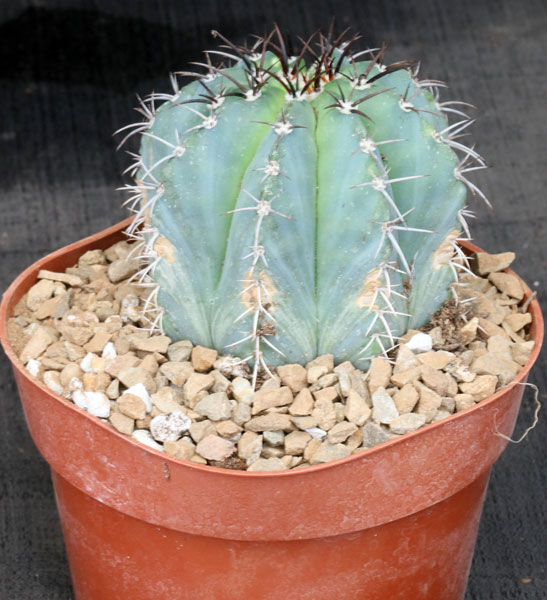 This beautiful blue-bodied Melocactus is from the Bahia area of Brazil. As the other Melocactus do, this species forms a cephalium with tiny red flowers. These plants are seedlings in 6-inch pots.