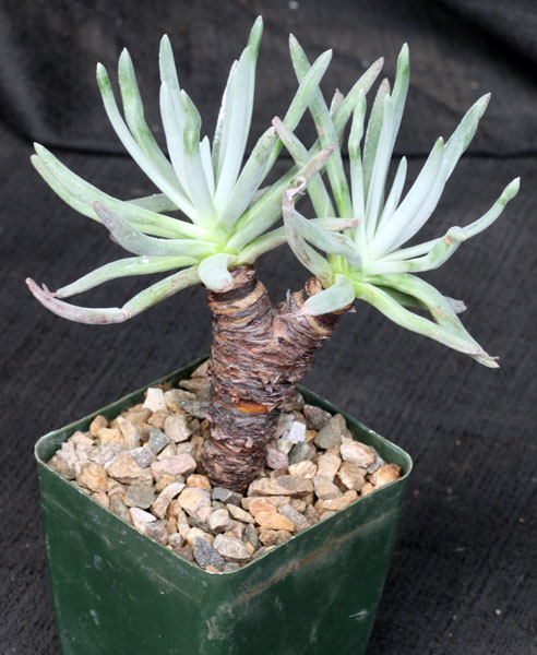 Dudleya attenuata in coastal Baja California in close proximity to the Pacific Ocean. These plants have short stems that bear rosettes of cylindrical reddish glaucous leaves. The flowers are tubular, upright, and whitish. Although this species is from a winter-rainfall region, we’ve are able to grow these plants in Tucson in full shade with infrequent summer watering. These plants are seedlings in 4-inch pots.