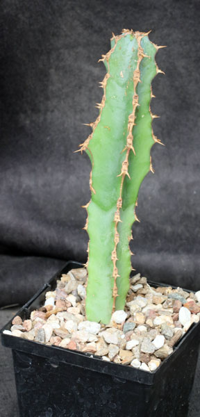 From Namibia, this species tends to grow on rocky slopes, forming shrubs that branch from the base. The branches are usually 6-angled and blue-grey, and the spines occur on a contiguous horny margin. We grow this species outside in Tucson, where it has been undamaged at 20F with full sky exposure. These plants are rooted cuttings in 5-inch pots.