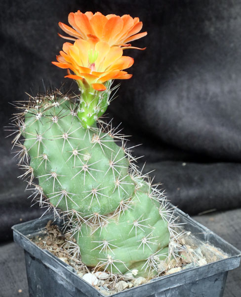 This species is widely distributed in the southwestern US from Arizona to Colorado and over into Texas. A number of former species have been lumped into this one. Very similar to Echinocereus triglochidiatus, it has short cylindrical green stems with sparse yellow-white spines. The flowers are red-orange and somewhat campanulate. This plant is frost hardy and probably capable of withstanding low temperatures to 15F. These plants are seedlings in 5-inch pots.