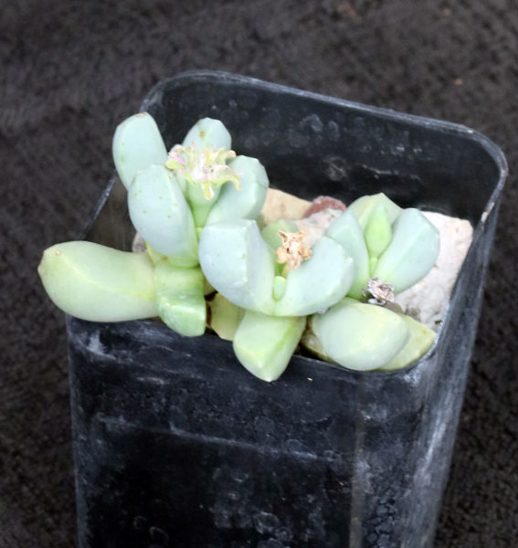 Some lump this into Dracophilus dealbatus but we’ll leave it separate for now. This mat-forming mesemb has gray-green fleshy leaves. The flowers are white to violet with yellow centers. These plants are seedlings in 2-inch pots.