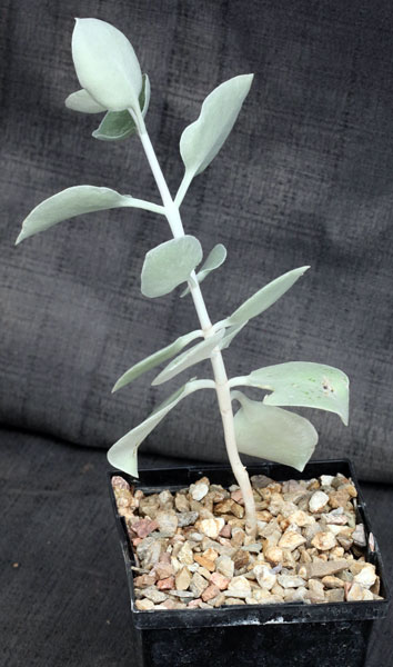 From southern Madagascar, Kalanchoe hildebrandtii has flowers that are yellow to greenish yellow. This species has minutely hairy leaves that are light gray-green in color, and it is a shrub that can grow quite tall. These plants are rooted cuttings in 5-inch pots.