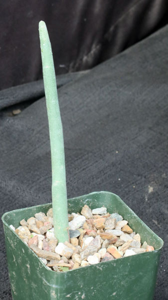 This species is from the greater Richtersveld region of northwestern South Africa and southern Namibia. This shrub has finger-sized stems that are waxy coated and gray-green in color without spines. The cyathia are dark red. This species has sap that quickly turns tacky, hence the species epithet. These plants are rooted cuttings in 4-inch pots.