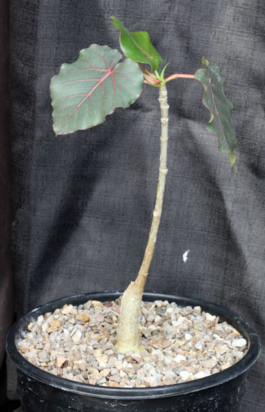 Widely distributed from Baja California to Sonora south to Oaxaca, Mexico, this beautiful pachycaul tree typically is associated with riparian settings. Here, we accept the lumping of the previously recognized Ficus petiolaris and F. palmeri, and these plants are the ones with red veins in the leaves. Often, this species hangs from cliffs, dipping its extremely long, white roots into permanent water. This is a classic plant for either bonzai or for perching on a rock, draping the roots over the sides and into the soil beneath. These plants are rooted cuttings in 2-gallon pots.