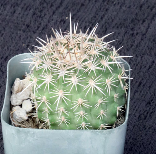 This relatively small, globose cactus is from the coast of the Pacific Ocean in southern Peru. An extremely variable species, the body of the plant is dark green with numerous ribs and dense, gray-brown spines. The flowers are relatively large and yellow, and the distinctive fruits are large and have an inflated appearance. These plants are seedlings in 2-inch pots.