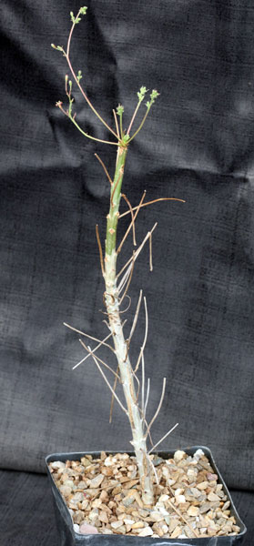 From Ethiopia, Somalia, and particularly northeastern Kenya, this interesting Commiphora has yellow shredding bark that reveals a yellow-green substrate. The leave pedicels are persistent, giving a shaggy appearance to the stems. The leaves are yellow green with red highlights, both on the leaf margins and their pedicels. These plants are seedlings in one-gallon pots.