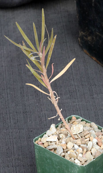 This is one of the threatened Euphorbia species from the Canary Islands. This shrub is rather distinctive for its gray-green coloration and broad lanceolate leaves. The cyathia essentially are purple. These plants are seedlings in 4-inch pots.