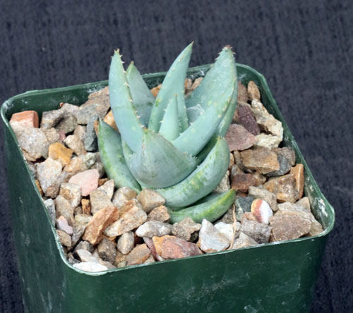From the Northern and Western Cape Provinces of South Africa, this is a relatively small species that grows on open plains. The leaves are blue-gray, have smooth surfaces, and lack marginal teeth. The flowers are relatively large and bright red, which is the reason collectors desire this species. These plants are seedlings in 4-inch pots.