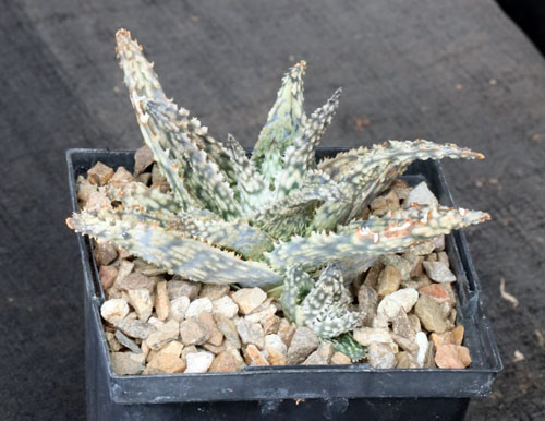 This nice little hybrid from Dick Wright is not black but instead is a complex cross of aloes that include A. albiflora, A. bakeri, A. descoingsii, and A. juvenna. It has nicely variegated, light green leaves with raised bumps on them. It makes a beautiful little addition to any Aloe collection, especially when it is in flower. These plants are rooted offsets in 5-inch pots.