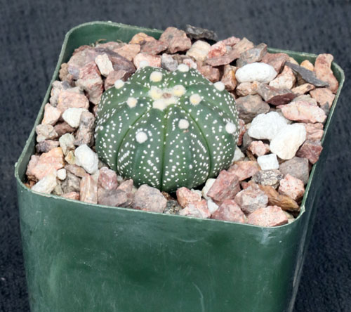 Commonly known as the "Sand Dollar" cactus, Astrophytum asterias is seriously threatened by habitat degradation and over collection in its range from southern Texas to Nuevo Leon and Tamaulipas in Mexico. This globular species has sparse white markings on the epidermis. Flowers are yellow and relatively large for the size of the plant. Easy to grow, we offer this species as seedlings in 4-inch pots.