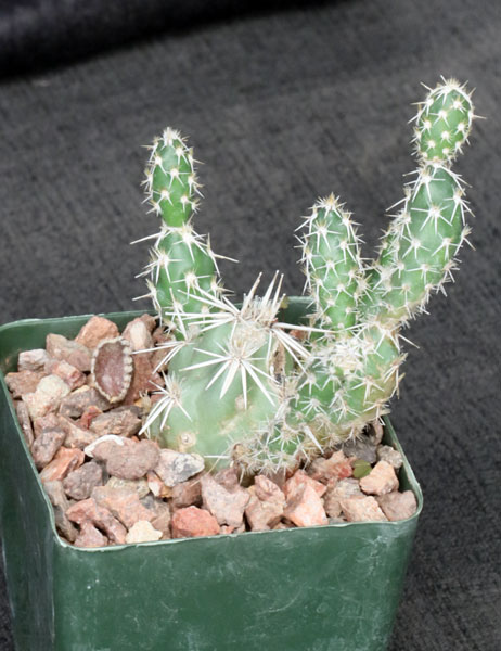 This mat-forming species is from the Great Plains grasslands of the United States extending into northern Mexico. The stems are nearly spherical and gray-green bearing appressed white spines. The flowers are bright yellow. These plants are rooted cuttings in 4-inch pots.
