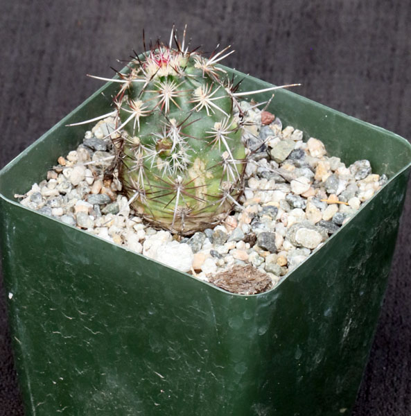 This form of the widely distributed Echinocereus viridiflorus is a low-elevation species from one locality in Texas. The short cylindrical stems are light green in color and lined with ribs with sparse yellow spines. The flowers are yellow-green with a lighter-colored center. These plants are seedlings in 4-inch pots.