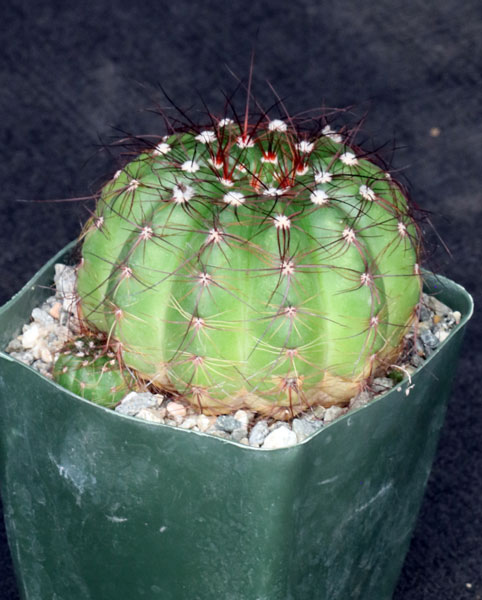 From the southeastern parts of South America, this is a solitary species with light green globose stems and yellow-white spines. The flowers are large and yellow. These plants are seedlings in 4-inch pots.