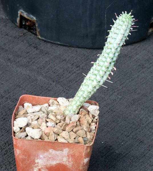 This variegate is of a species that occurs in the Western Cape Province of South Africa. We believe this previously was sold as a variegate of E. mammillaris, but it is not as robust as that species. These plants, like the typical E. fimbriata,has clusteredspiny tubercles on the stems, creating a collared appearance. This variegate is blue-grey in color, and extremely pretty. These are rooted cuttings in 3-inch pots.