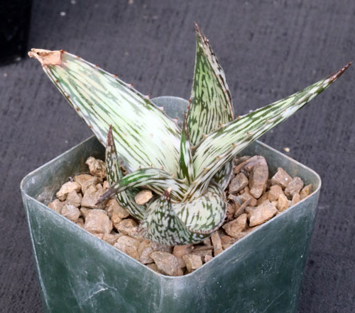 This small species is from Somalia. Typically solitary, but sometimes clustering, it is part of the complex that includes A. somaliensis and A. harlana, and like those species, A. peckii has a low rosette bearing glossy, multipatterned leaves. The flowers are greenish-yellow. These plants are seedlings in 4-inch pots.