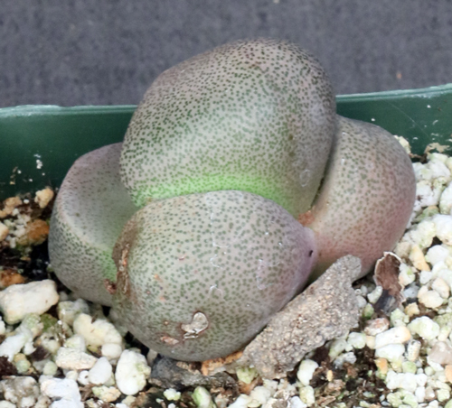 Never abundant but widely distributed, this species, from western South Africa, features paired, hooded leaves. The leaves have the classic split-rock appearance, with small dark spots on a green-brown leaf. The flowers are yellow. These plants are seedlings in 4-inch pots.