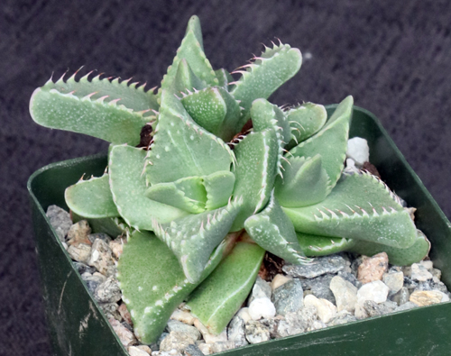 This is one form of the famous “tiger jaws” species, which occurs in the Eastern Cape Province of South Africa. These plants have faint to prominent spots on the leaves and the teeth that earned the common name. The flowers are a bright yellow. These plants are seedlings in 4-inch pots.