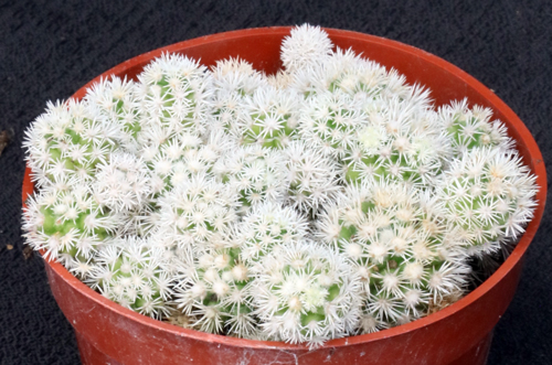 From the mountainous regions of east-central Mexico, this small species is considered by some to be part of Mammillaria vetula. The plants have a light-green body with numerous white spines but generally lacking a central spine. The flowers, likewise, are small and yellow. These plants are rooted offsets in 4-inch pots.