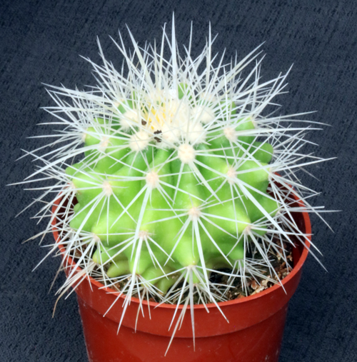 This form, known as the White Barrel, is from a restricted area in Queretaro, Mexico. Uncommon, the white form of Echinocactus grusonii is a very distinctive landscape species, although it has less frost tolerance than does the better-known typical species. We’ve grown this in the ground for many years with no problems, but these plants do have some rib damage from past frosts that you have to look closely to see. The plants should grow out of this minimal damage. These plants are seedlings in 5-inch pots.