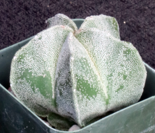 From the Chihuahuan Desert in Mexico, this beautiful species, known by its gringo name of Bishops Cap, has no spines and a miter form. The body is variously gray-green with small white spots, sometimes quite dense. The flowers are relatively large and yellow. These plants are seedlings in 2-inch pots.