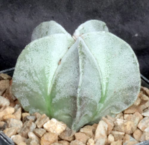 From the Chihuahuan Desert in Mexico, this beautiful species, known by its gringo name of Bishops Cap, has no spines and a miter form. The body is variously gray-green with small white spots, sometimes quite dense. The flowers are relatively large and yellow. These plants are seedlings in 5-inch pots.