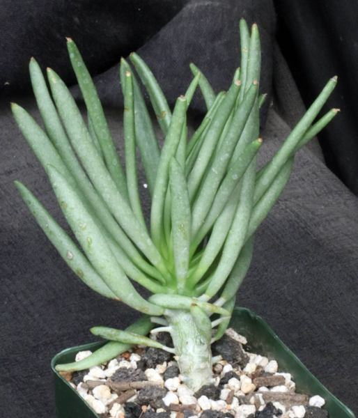 This shrubby species, with its knobby, gray-black branches and trunk with shredding yellow-gray bark, is from the Western Cape Province of South Africa. The branches are brittle and readily break, and they can be rooted. The leaves are cylindrical, relatively small, and green, and they tend to be clustered at the ends of the branches. The flowers are yellow and can be recurved upwards. These plants are rooted cuttings in 4-inch pots.