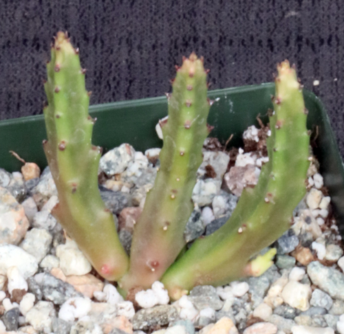 From the Western Cape Province of South Africa, this clumping species has dark-green stems covered with tubercles. The flowers are relatively large and liver-colored. These plants are rooted cuttings in 4-inch pots.