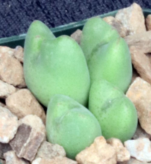 These small plants with their bilobate heads are from the greater Richtersveld area of Namaqualand, Northern Cape Province, South Africa. A mat-former, the plants have small gray-green heads that are somewhat spade-shaped with a cleft in the middle top of the leaf. The flowers are orange and large in comparison to the plants. These tiny plants are seedlings in 2-inch pots.