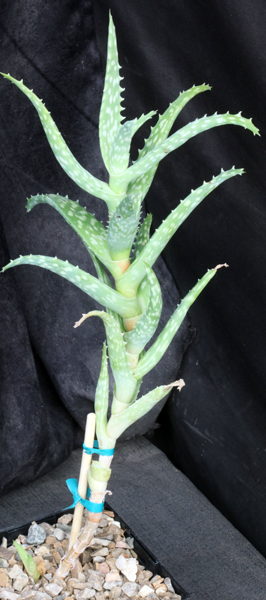 From Socotra, where it hangs from limestone cliffs, this aloe has beautiful small rosettes with white-spotted leaves. The plant offsets prolifically and produces red flower panicles. We have had our plants outside for years, where they have withstood 25F with overhead protection. Our plants are rooted cuttings in 5-inch pots.