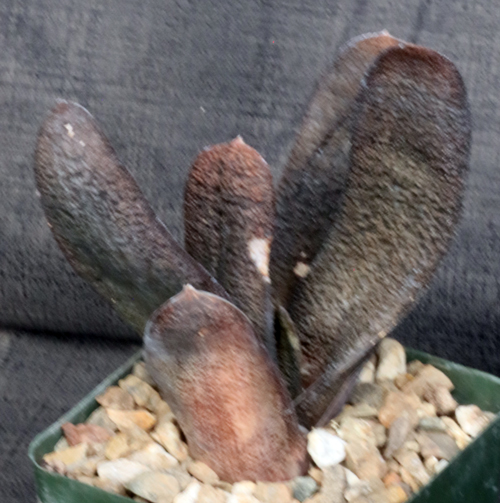 This is one of the most popular species of Gasteria in cultivation, because its leaf form and coloration is so striking and because of its large inflorescence. It is a highly variable species with many cultivars distinguished on the basis of leaf color and amount and color of the tubercles. The clone Barberton has long been in cultivation and has dark green (nearly black) leaves with dense tubercles. These plants are rooted offsets in 4-inch pots.