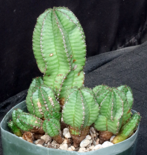Euphorbia polygona forms tall, columnar stems that are green with a blue-grey cast. The crowning spines tend to be reddish when growing. These seedlings are in 5-inch pots.