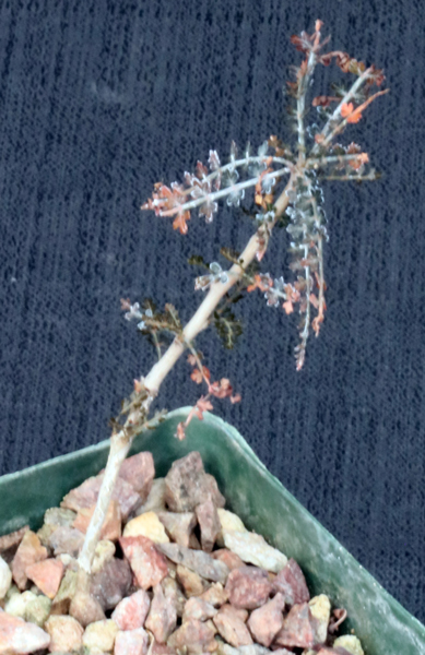 From Socotra, Yemen, Boswellia asplenifolia can be thought of as a higher-elevation form of B. socotrana. In habitat, these trees are tapped for their sap, which was the original frankincense, and the bark has that faint smell of incense. These plants are seedlings in 4-inch pots.