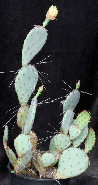 This species is widely distributed in the southwestern United States, ranging from Texas to southeastern Arizona. The pads of this low-growing species are reddish-purple with typically black and white spines on the edges. The flowers are yellow. These plants are rooted pads in 3-gallon pots.