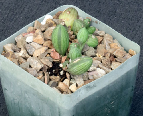 This little vining species is known but the utterly stupid name of “String of Watermelons.” It is from southern Namibia in the northern part of greater Namaqualand. The bulbous leaves are green with longitudinal white lines, giving it an overall appearance of a melon. The flowers are yellow-orange. These plants are rooted cuttings in 4-inch pots.