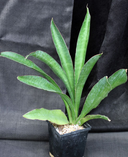 This recently described species is from the Chimanimani Mountains of Zimbabwe. It is characterized by long green leaves that tend to fold over and have a distinctive reddish margin. This species resembles S. frequens, only the leaves are much larger and longer. These plants are rooted offsets in 5-inch pots.