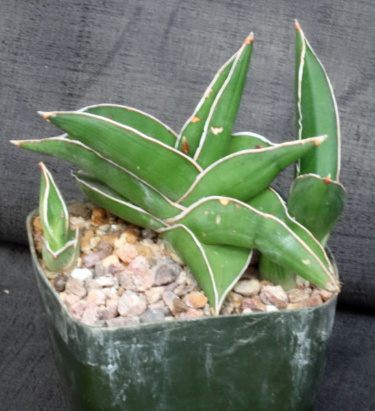 This species was originally collected by Lavranos (Lav 23154) north of Mogadishu, Somalia. These slow-growing plants tend to have a revolute form when young, changing to a distichous form with stout light-green unspotted leaves. The flowers tend to be mostly violet in color. These plants are rooted offsets in 5-inch pots.