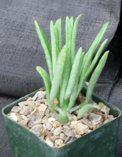 This species is from the Western and Northern Cape Provinces of South Africa. A winter-growing species, it is columnar with few branches. The leaves are green and cylindrical, and the leaf peduncles become elongated tubercles, creating an attractive appearance to the plant. The flowers are yellow, relatively large, and tubular. These plants are rooted cuttings in 4-inch pots.