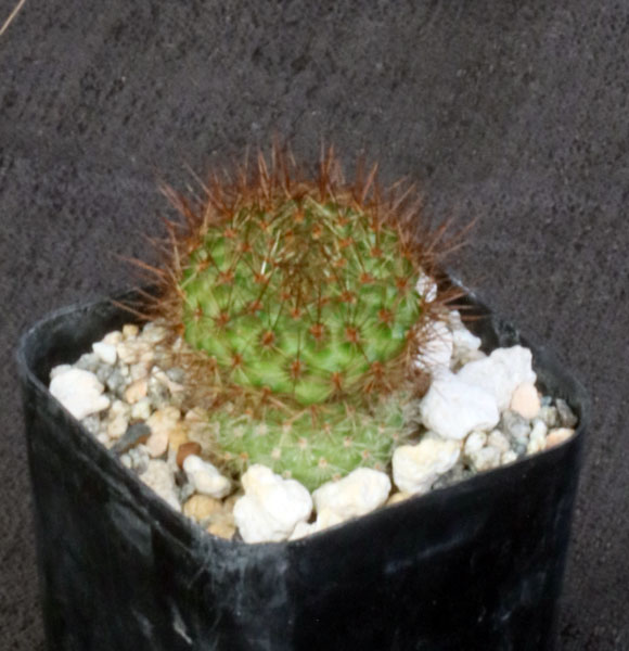 From Bolivia, this species is now considered part of Rebutia fiebrigii, a trashcan species with lots of things lumped into it. With its orange-red flowers and sparsely offsetting, medium green globose stems, this is a nice container plant. These plants are seedlings in 2-inch pots.