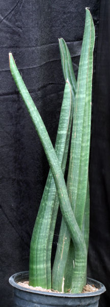 This species is from southern Malawi, and these plants are propagated from material originally collected by Dave Richards (R1734). Once known as Super Bat, it has a brownish green color with little variegation and a channel that runs the full length of the leaf. The capitate flowers arise from the roots and are purplish-white. These plants are rooted offsets in 5-gallon pots.