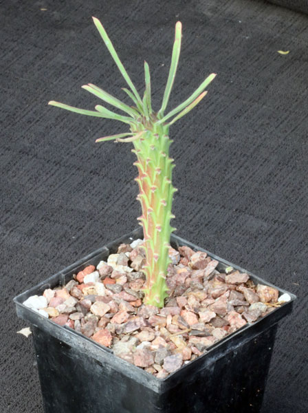 From the Klein Karoo of the Western Cape Province of South Africa, this species has a single, upright succulent stem bearing linear leaves near the apex. Woody peduncles persist on the stems, giving the appearance of long spines. This species is related to Euphorbia clava. These plants are seedlings in 5-inch pots.