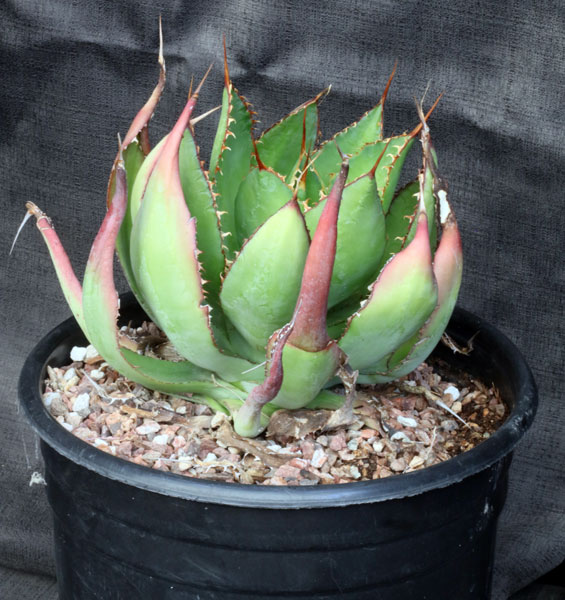 This beautiful Agave is from the northwestern Mexican states of Sonora, Chihuahua, and Sinaloa. The name refers to cow horns, which describes the opposite pattern of the fierce horn pattern on the leaf margins. This large rosette species does not offset. The leaves are a lovely yellow-green with some red highlights, and they are glossy with prominent leaf imprints. This species is frost sensitive, although in our experience we get marginal leaf damage at 23F. These plants are seedlings in 3-gallon pots.