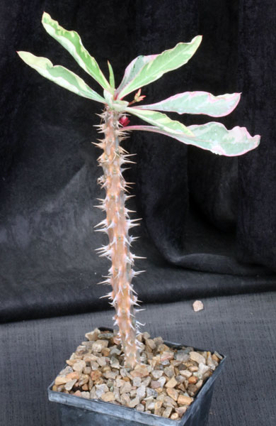This cultivar has relatively large, variegated leaves for a E. milii. The leaves are tinged with yellow and red. The cyathia are yellowish with green streaks and splotches. These plants are rooted cuttings in 5-inch pots.