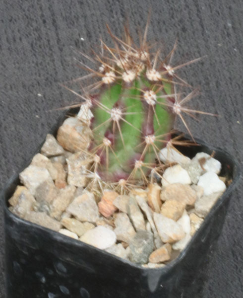 This species is from the Florida Keys, where it grows amongst sand dunes. It is a scrambling cactus with round, ribbed stems and numerous white spines. The flowers are large, white, and open at night. IThese plants are rooted cuttings in 2-inch pots.