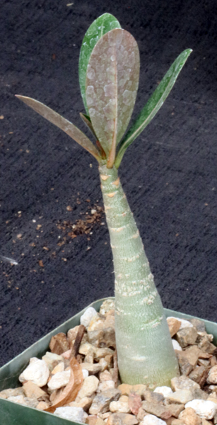 This species, from the southern Arabian Peninsula, has numerous branches arising from a low, wide caudex. The smallish flowers are pale pink, and the leaves are softly pubescent. This cultivar was selected because its appearance is darker than the typical species and I guess the name is kind of cool. These seedlings are in 4-inch pots.