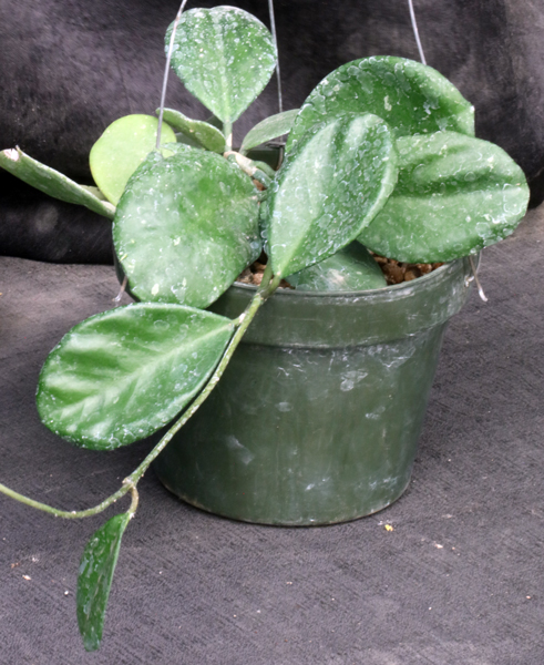 This species is native to the Indian subcontinent and Indonesia. The leaves are broad and marked with irregularly shaped brown spots. Although this species is related to Hoya kerrii, it differs in its ovate leaves and larger flowers, which are pink with red centers. These plants are rooted cuttings in 6-inch pots.