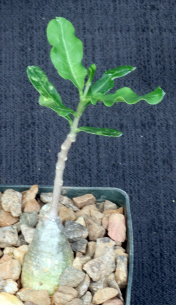 Currently known as Fockea capensis, We’ve retained the original name for now. This species is from the Eastern and Western Cape Provinces of South Africa. Like Fockea edulis, Fockea crispa is a great cucurbit caudiciform with shiny crinkled leaves; unlike F. edulis, this species grows inland in the Karoo. The stem protrudes above ground and has little warts on the gray skin. The stems have milky sap. Our plants are seedlings in 3-inch pots.