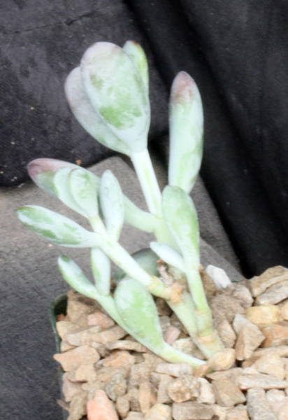 This species is from central Mexico. It has numerous upward-pointing clavate (club-shaped) gray-green leaves. It has a stem but with age becomes decumbent, which makes it ideal for hanging pots. The flowers are small and greenish-red. These plants are rooted cuttings in 4-inch pots.